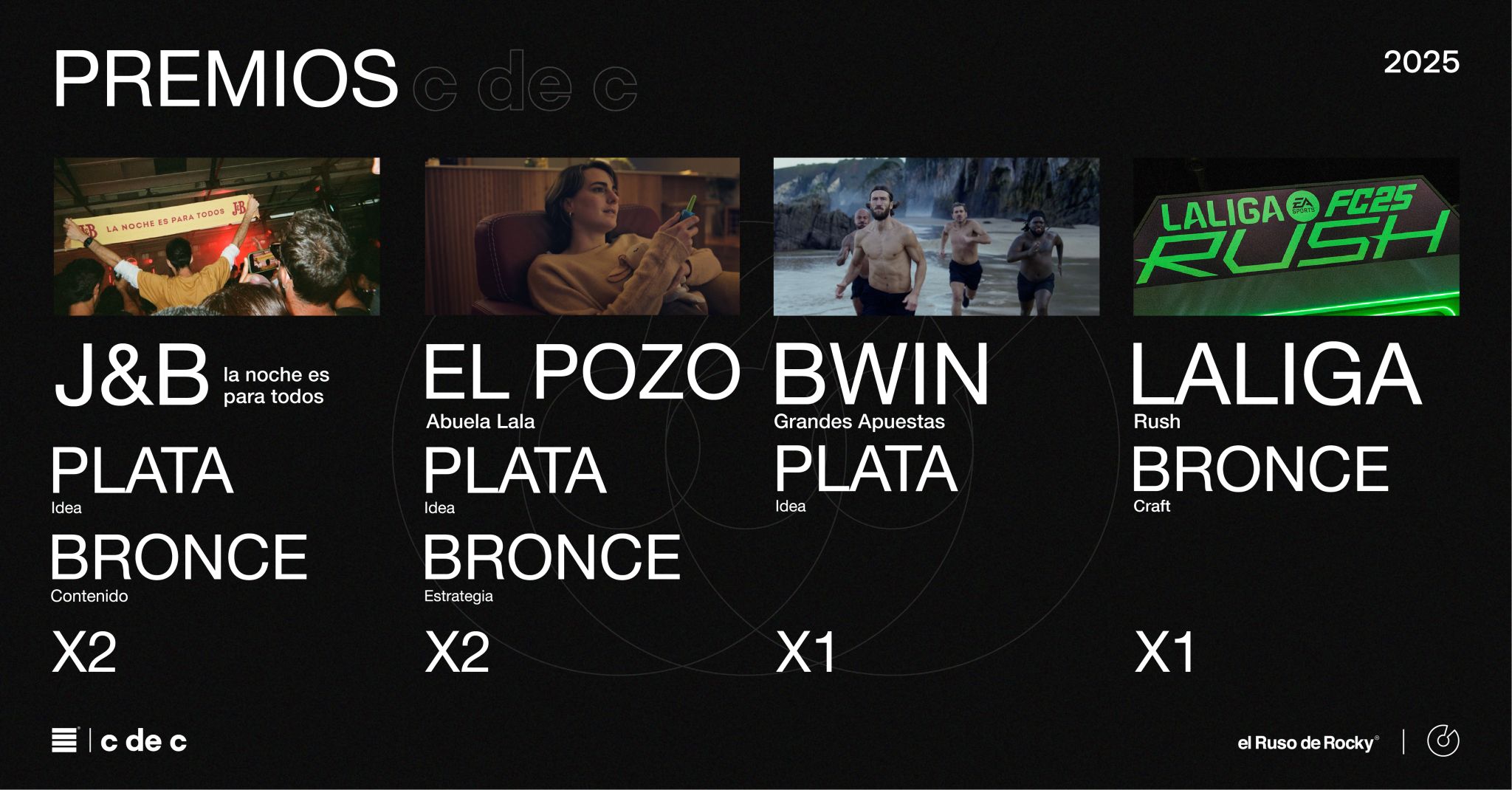 7 oros, 1 plata, 2 bronces y el Gran Premio Nacional de la creatividad del CdeC con «Orgullo de Pueblo» y «She» de J&B. Además de 12 menciones en el Anuario 2023 para: Abante Asesores «La riqueza no es solo dinero»,Fundación Aladina «Uno para todos»,Pascual «Nunca dejemos de crecer» y de nuevo J&B «She» y «Orgullo de Pueblo».